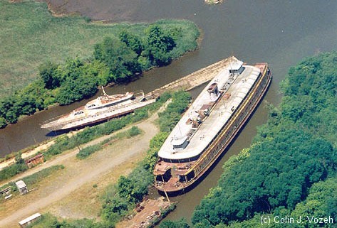 Google Earth shows the yacht was docked in the river in 1995. By 2002 it was wedged up the side creek. It looks very stuck at this point. In its current condition, it will have to be cut in pieces and trucked away. The Blue Jacket may no longer be leaking fuel and oil, but it still falls under the "Attractive Nuisance" doctrine.